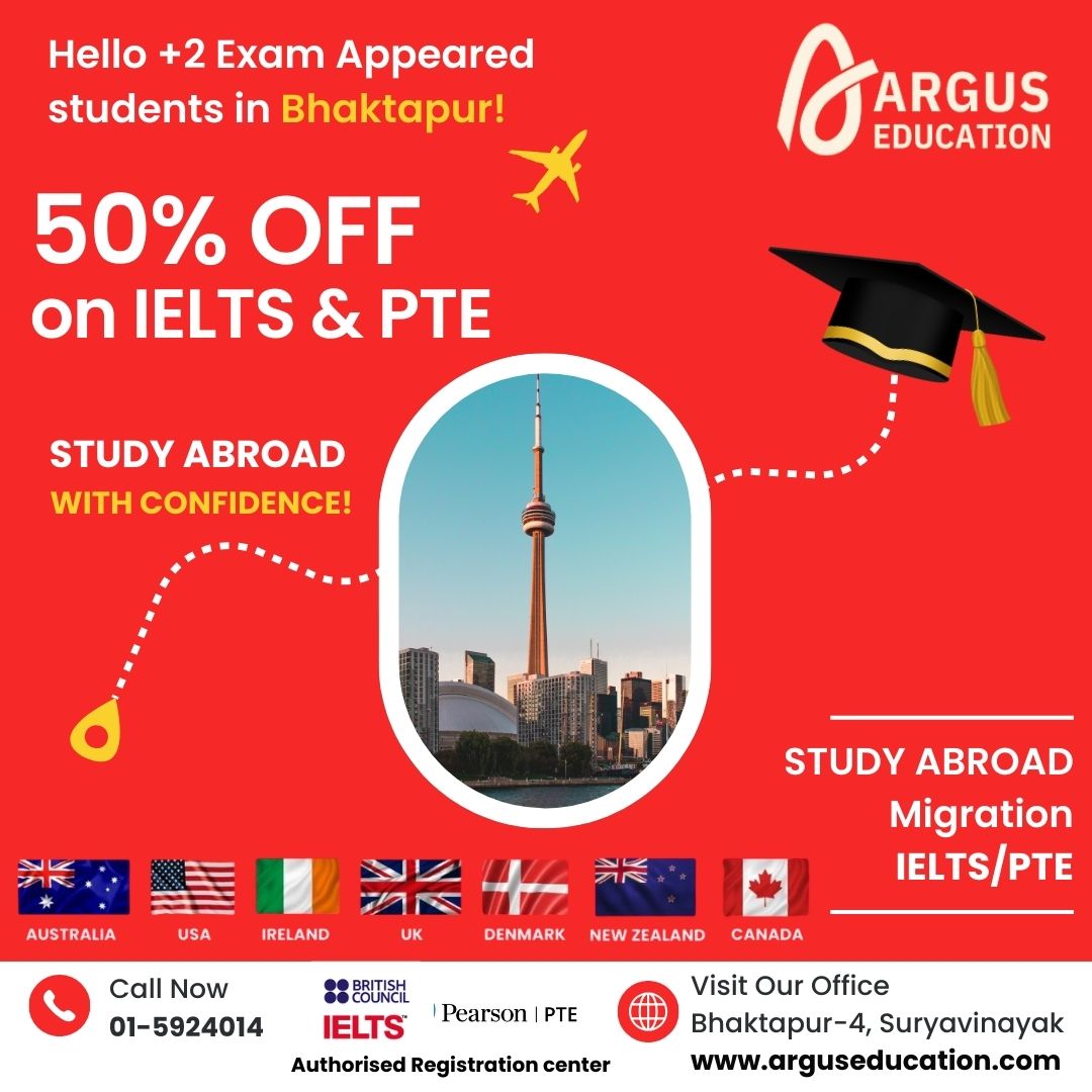 भक्तपुर, जेठ ४ । भक्तपुर नपा वडा नं ४ सूर्यविनायक अरनिको राजमार्गमा अवस्थित ग्लोबल ब्राण्ड आर्गस एजुकेशनमा +२ को परिक्षा दिएर बसेका विद्यार्थीहरुलाई आइएलटिएस र पिटिई (IELTS and PTE ) मा ५०% छुट हुने भएको छ।