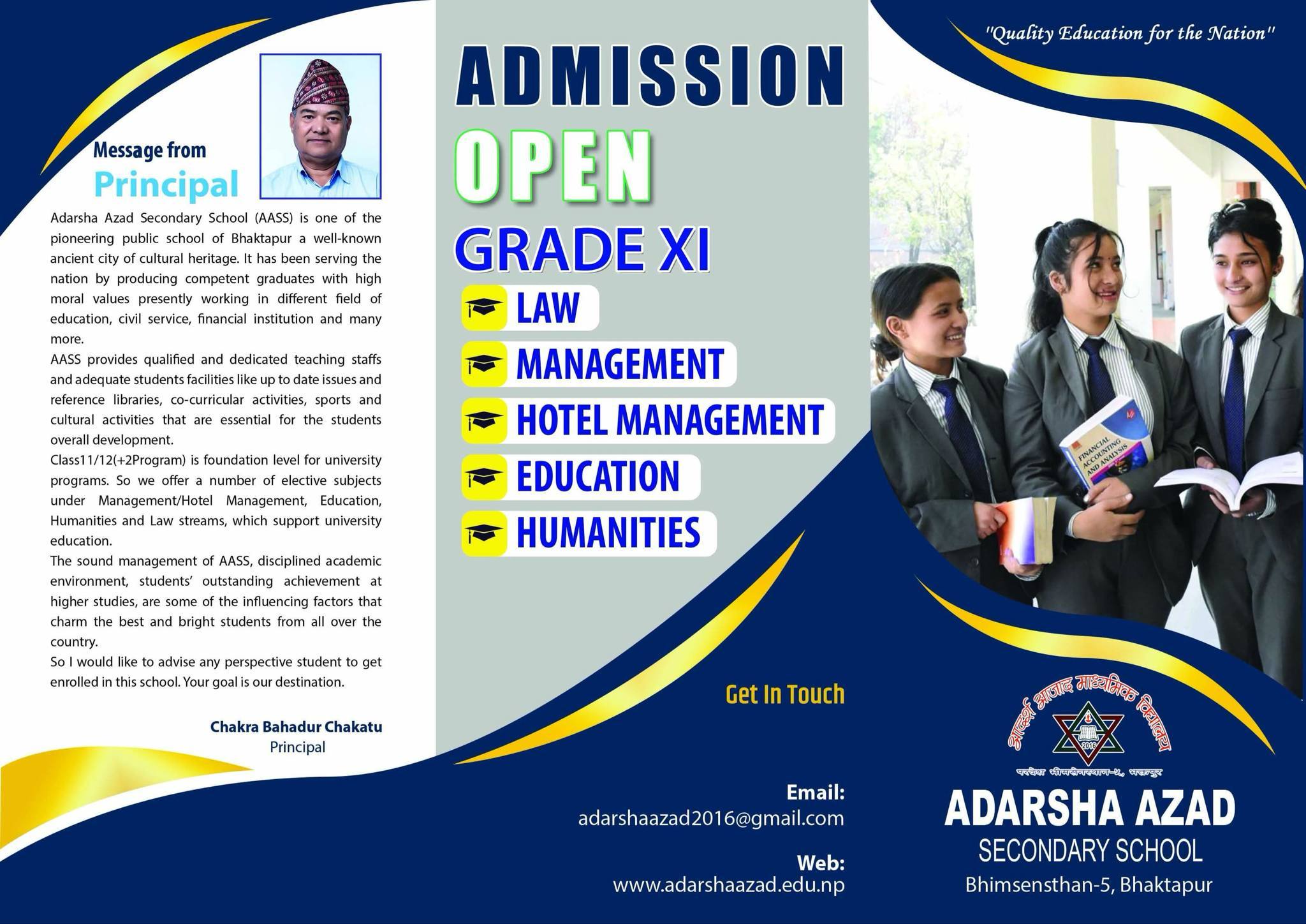भक्तपुर, असार १८ । भक्तपुर नगरपालिका–५ मा अवस्थित आदर्श आजाद माध्यमिक विद्यालय हाल एसइइ परीक्षाफलपछि +२ तहमा भर्ना लिने विद्यार्थीहरूको प्रमुख रोजाइ बन्न थालेको छ। विद्यालयले व्यवस्थापन, शिक्षा, कानुन, मानविकी र होटल म्यानेजमेन्ट संकायमा कक्षा ११ का लागि भर्ना खुला गरेको छ।