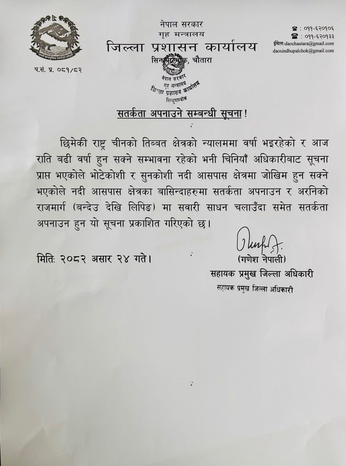 काठमाडौं, असार २४ । जिल्ला प्रशासन कार्यालय सिन्धुपाल्चोकले भोटेकोशी र सुनकोशी नदी आसपासका स्थानीयलाई सतर्कता अपनाउन सूचना जारी गरेको छ ।