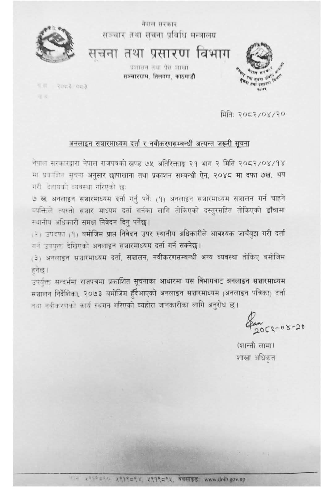 ‘उपर्युक्त सन्दर्भमा राजपत्रमा प्रकाशित सूचनाका आधारमा यस विभागबाट अनलाइन सञ्चारमाध्यम सञ्चालन निर्देशिका, २०७३ बमोजिम हुँदैआएको अनलाइन सञ्चारमाध्यम (अनलाइन पत्रिका) दर्ता तथा नवीकरणको कार्य स्थगन गरिएको व्यहोरा जानकारीका लागि अनुरोध छ,’ सूचनामा भनियको छ।