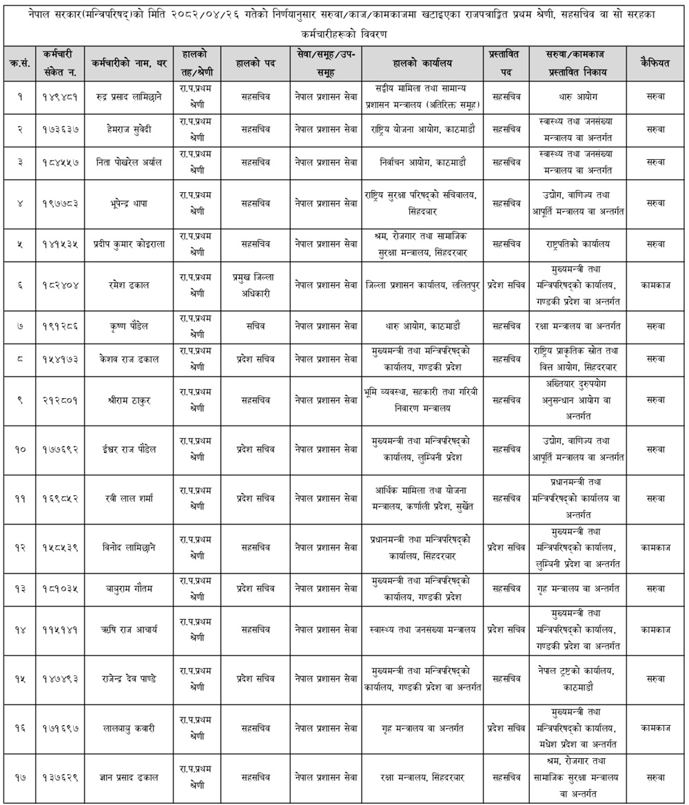 विभिन्न मन्त्रालय, आयोग, जिल्ला प्रशासन कार्यालय, प्रदेशका मन्त्रालय लगायतमा कार्यरत सहसचिवहरूको सरुवा भएको हो ।