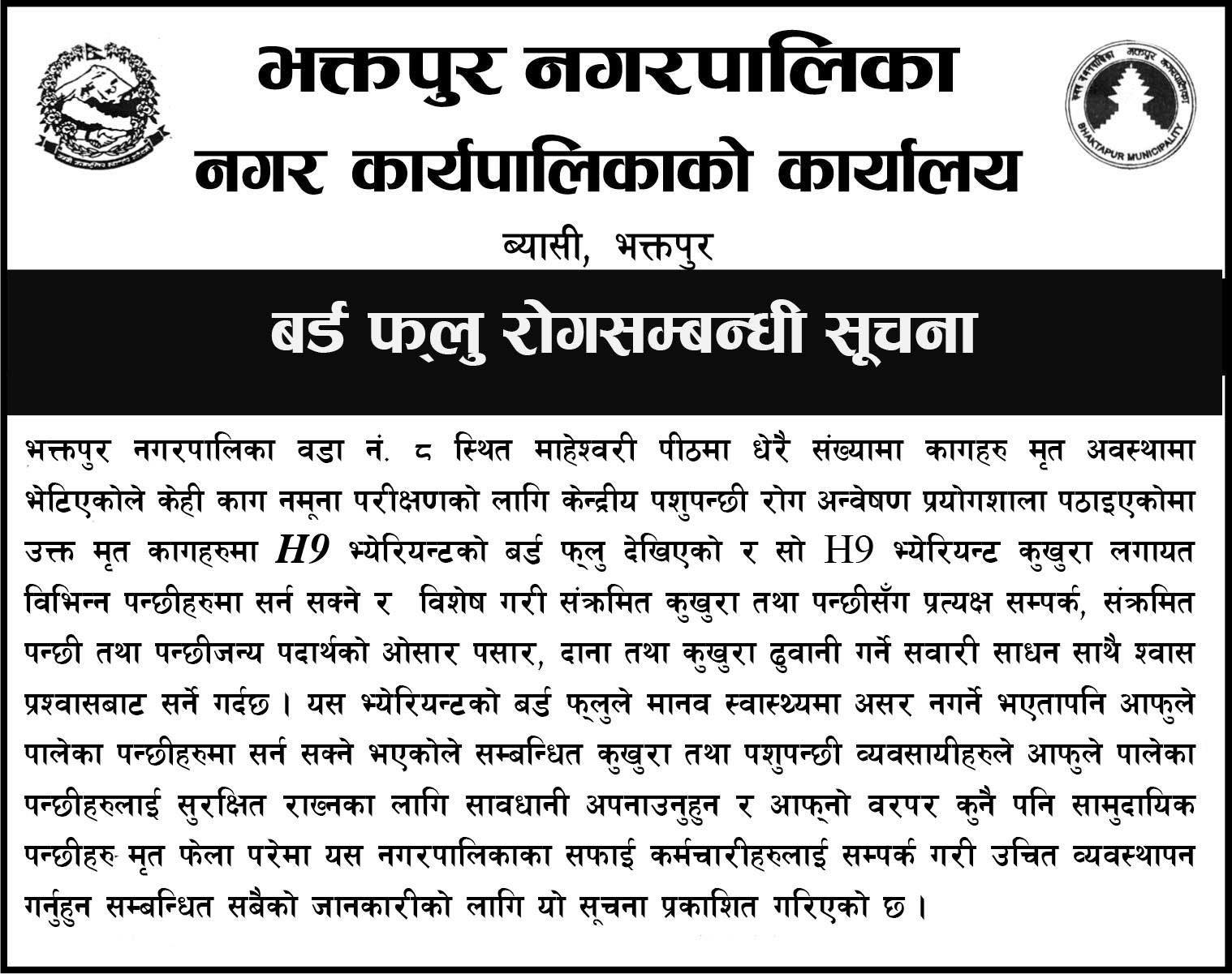साथै, वरपर कुनै पनि स्थानमा पन्छी मृत अवस्थामा फेला परेमा तत्काल नगरपालिकाका सरसफाइ कर्मचारी वा सम्बन्धित निकायलाई जानकारी गराई उचित व्यवस्थापन गर्न आग्रह गरिएको छ।