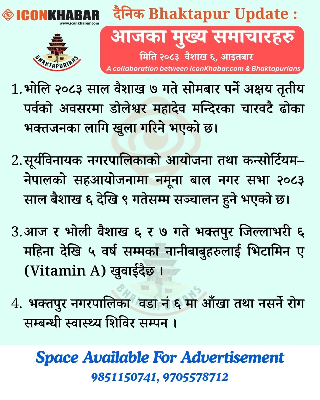भक्तपुर, वैशाख ६ । IconKhabar.com र Bhaktapurians बीचको सहकार्यमा “दैनिक भक्तपुर अपडेट”। हरेक रातको ९ बजे भक्तपुर जिल्लामा दिनभर भएका विभिन्न