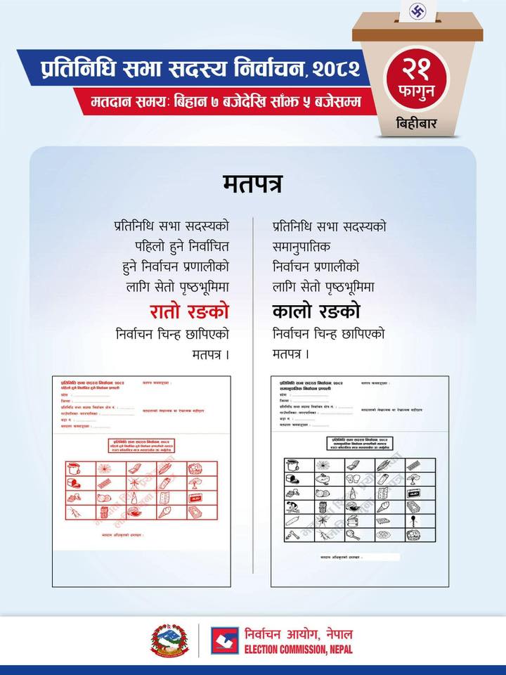 काठमाडौं, फागुन २० । भोलि सञ्चालन हुने निर्वाचनमा दुई प्रकारका मतपत्र प्रयोग गरिने भएको छ। निर्वाचन प्रक्रियालाई स्पष्ट र